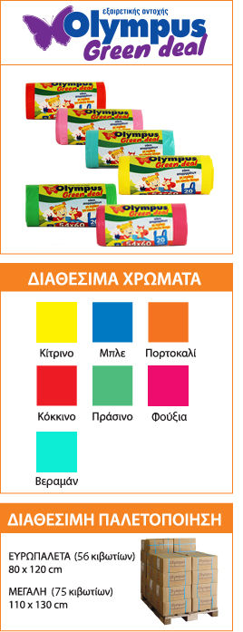 Οι σάκοι απορριμμάτων Olympus Professional χάρη στη μοναδική σύνθεσή τους περιέχουν έως και 50% λιγότερο πλαστικό. Έτσι αφήνουν το μικρότερο δυνατό οικολογικό αποτύπωμα, χωρίς να επηρεάζεται η αντοχή τους.