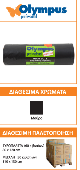 Οι σάκοι απορριμμάτων Olympus Professional χάρη στη μοναδική σύνθεσή τους περιέχουν έως και 50% λιγότερο πλαστικό. Έτσι αφήνουν το μικρότερο δυνατό οικολογικό αποτύπωμα, χωρίς να επηρεάζεται η αντοχή τους.