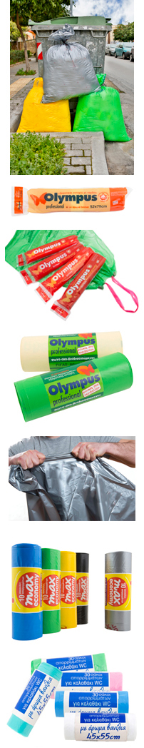 Σάκοι απορριμμάτων με κορδόνι, σε μεγάλη ποικιλία διαστάσεων και τύπων (βαθμός αντοχής, χρώματα).